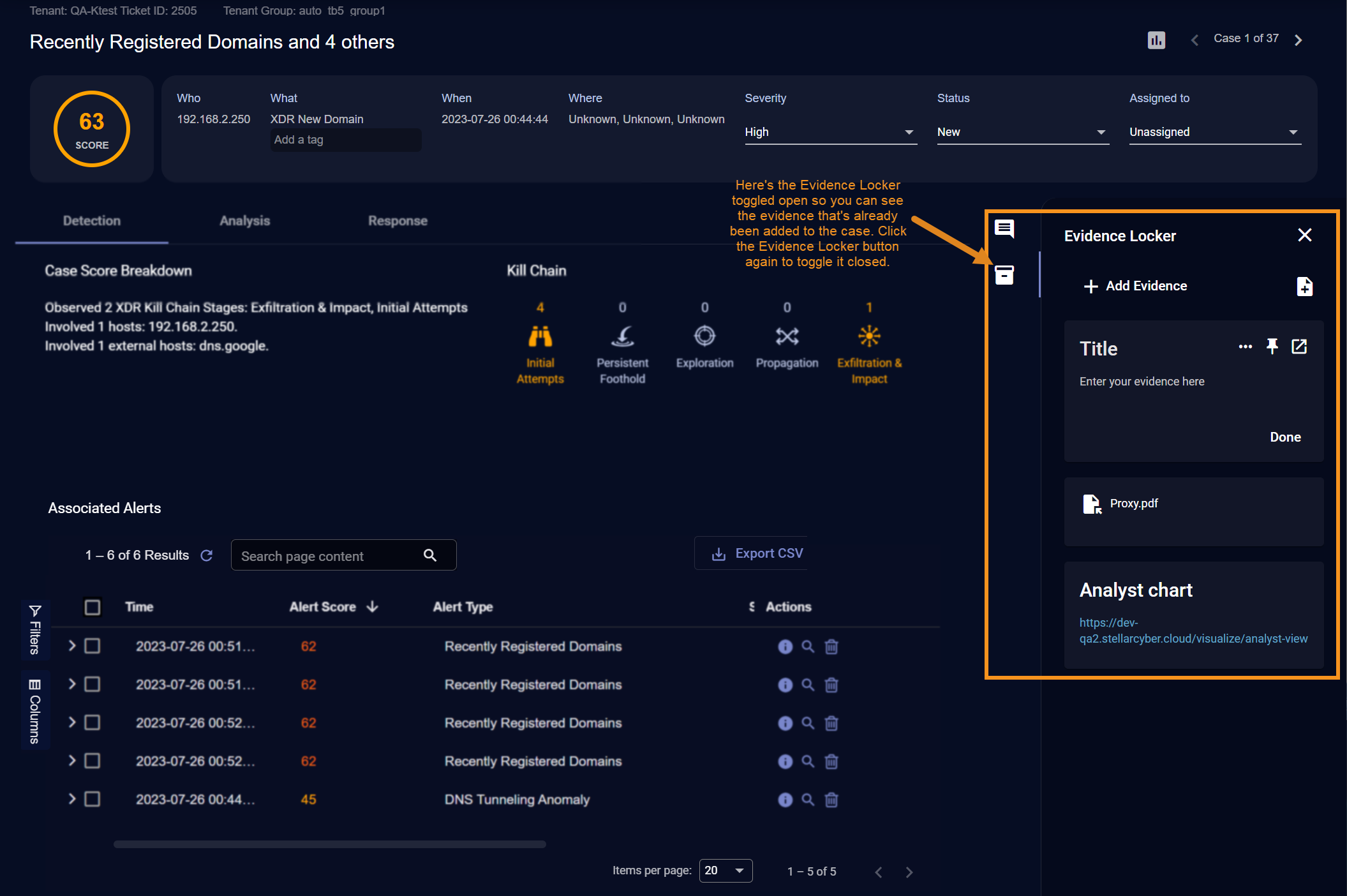 Evidence Locker – The Evidence Locker (described in detail below) provides a handy spot for you to store and share items that help your team bolster its case, including emails, PDF files, CSV files, and links to other locations in the Stellar Cyber platform.