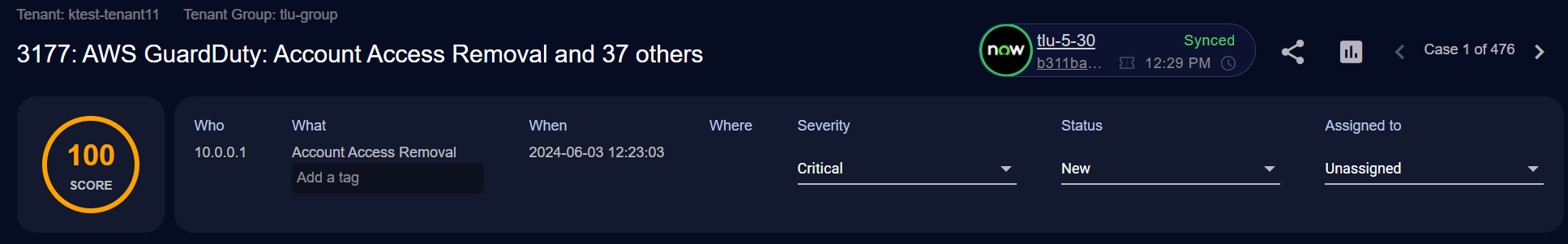 Case Identification – The Case Identification panel is at the top of the page and stays visible throughout all Case Detail views. It gives you the who, what, when and where for a case, including the the system-generated Case ID, the case name, the associated tenant and tenant group, and the case's score, color-coded to indicate its severity. Names for system-generated cases start out with a summary of the underlying alerts and date. You can click in the name cell to edit the system-generated name.