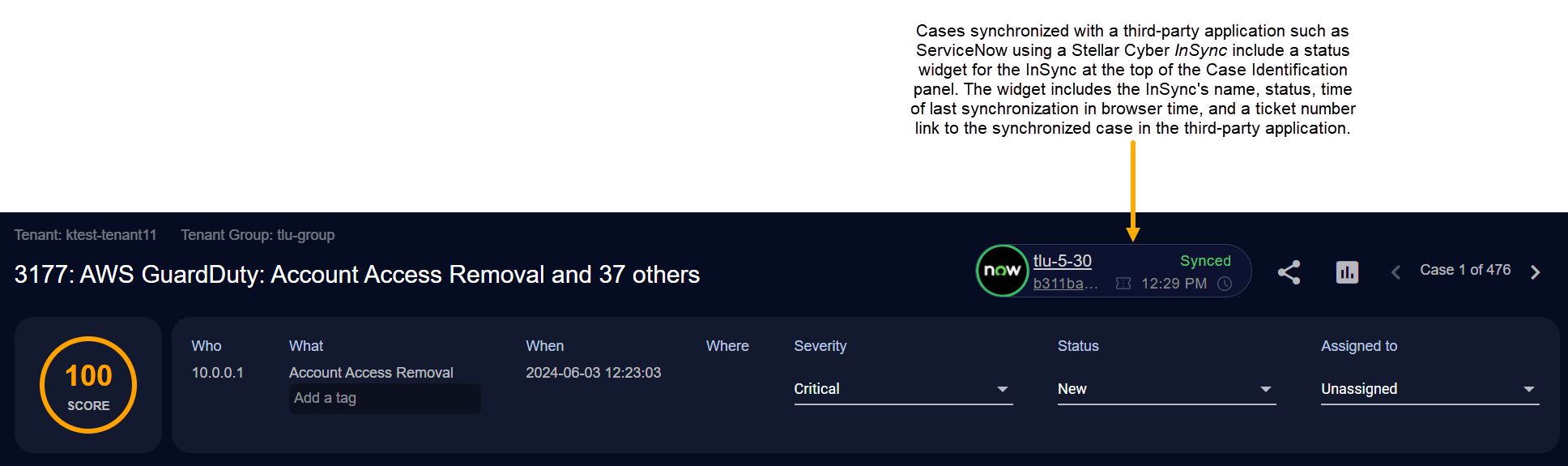 Cases synchronized with a third-party application such as ServiceNow using a Stellar Cyber InSync include a status indicator for the InSync at the top of the Case Identification panel, as illustrated below.