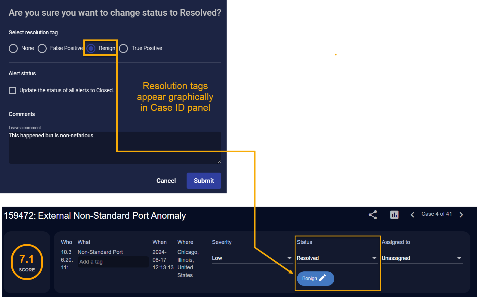 When you set a case's Status to Resolved, a dialog box appears that lets you select a tag describing the case's resolution. Once applied, the tag appears as a special graphic indicator in the Case Identification panel. The figure below summarizes this: