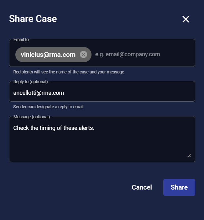 to open a dialog box where you can share the case via email:Supply the destination address, an optional reply-to address, and any message you'd like to include. The recipient will see the name of the case and your message, along with a link to the case itself.