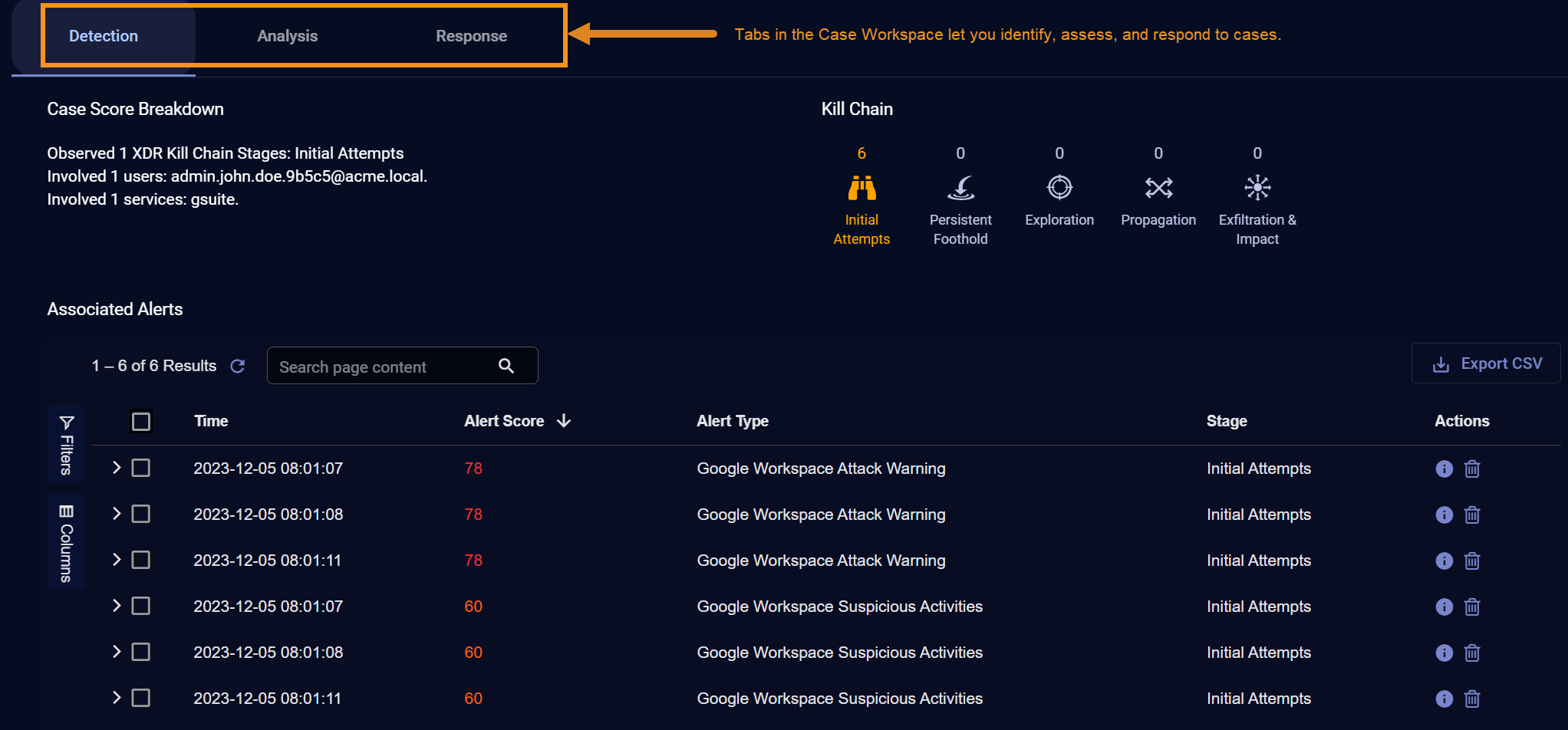 Detection Tab – The Detection tab provides a high-level summary of the case, including a breakdown of what Stellar Cyber has seen and why it is scoring the case the way it is. You can also see a summary of the XDR Kill Chain stages involved, and a table of Associated Alerts.