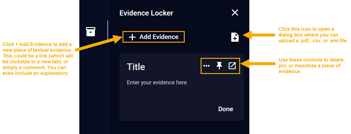 to pin a particular piece of evidence to the top of the Evidence Locker's list. Once evidence has been pinned, its pin icon changes color. Click the pin button again to unpin the piece of evidence. Pinned evidence is sorted by the time at which it was pinned, with the most recently pinned evidence at the top. -