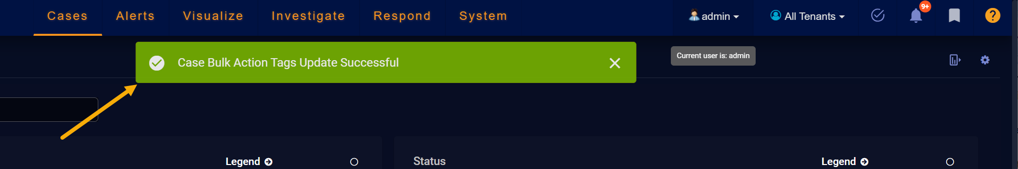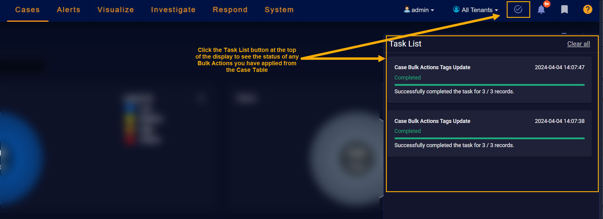 Once you apply a bulk action to one or more cases, Stellar Cyber displays a success or failure message at the top of the display and keeps track of its progress in the Task List.