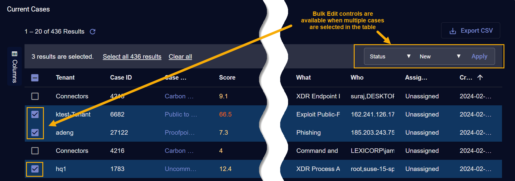 The Current Cases table supports bulk edits to the Status, Tags, or Assignee of multiple cases. Use the following procedure: