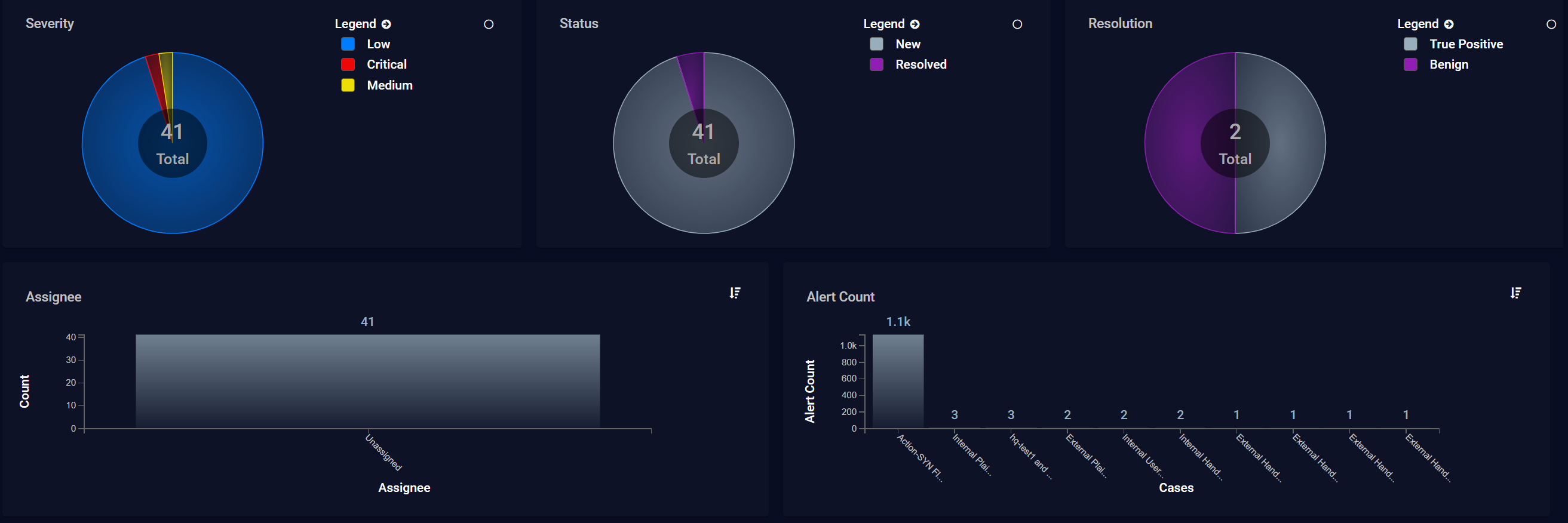 Circular charts (Severity , Status, and Resolution) can be viewed in either donut or pie mode using the controls at the top right of the individual charts and are color-coded using the supplied legend. Bar charts (Assignee and Alert Count) can be viewed in either horizontal or vertical mode using the controls at the top right of the individual charts.