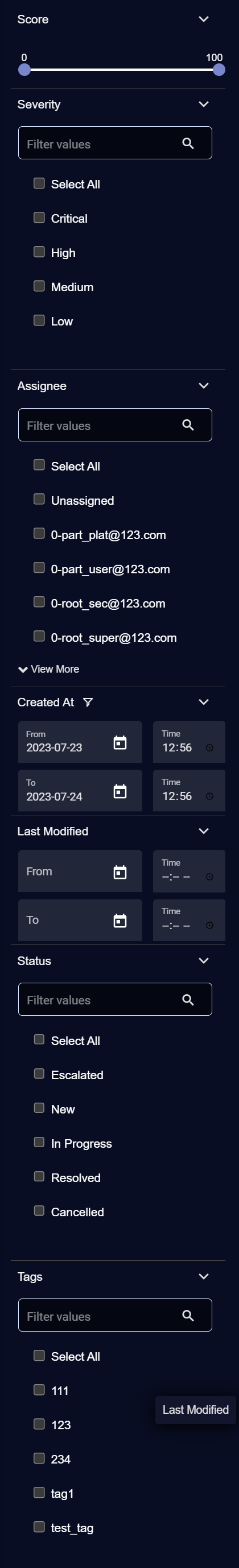 Last Modified – Use the date controls to specify a range for the modification dates of the cases to display. Modifications include changes to a case's alerts, severity, status, comments, or evidence.