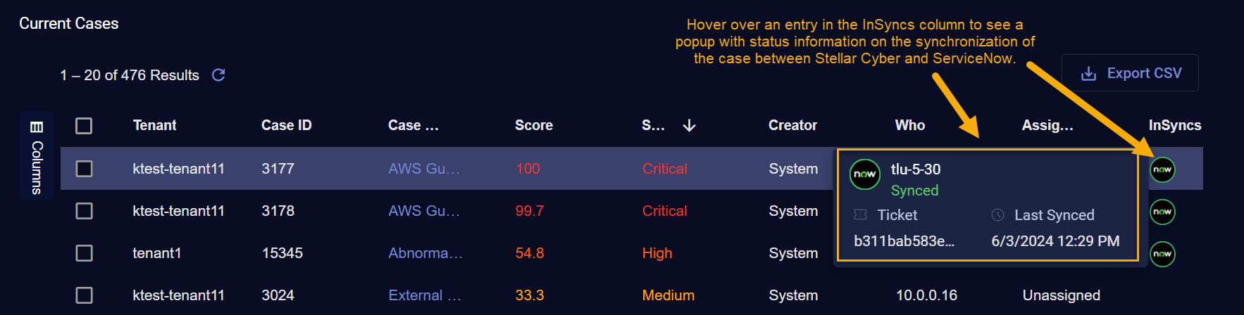 An InSync is an "integration synchronization" between Stellar Cyber and a third-party help desk or ticket management system, such as ServiceNow. InSyncs provide bidirectional exchange of alerts and cases between Stellar Cyber and the third-party application. Once an InSync is in place, changes made to an alert or case on one side of the InSync are reflected on the other; for example, if you change the name of a synced case in Stellar Cyber, the name change is also reflected in the synchronized table in ServiceNow.