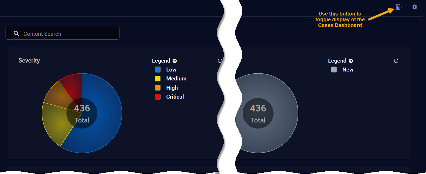 The Case Dashboard is displayed by default, but you can toggle it closed to optimize your available screen space with the button at the upper right of the Cases view: