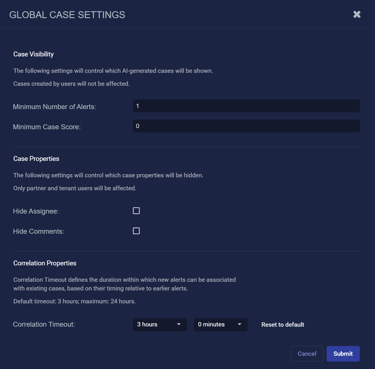 The Correlation Properties settings let you specify a global Correlation Timeout for your organization. The Correlation Timeout specifies the time window within which new alerts are considered for correlation into both new and currently open cases.