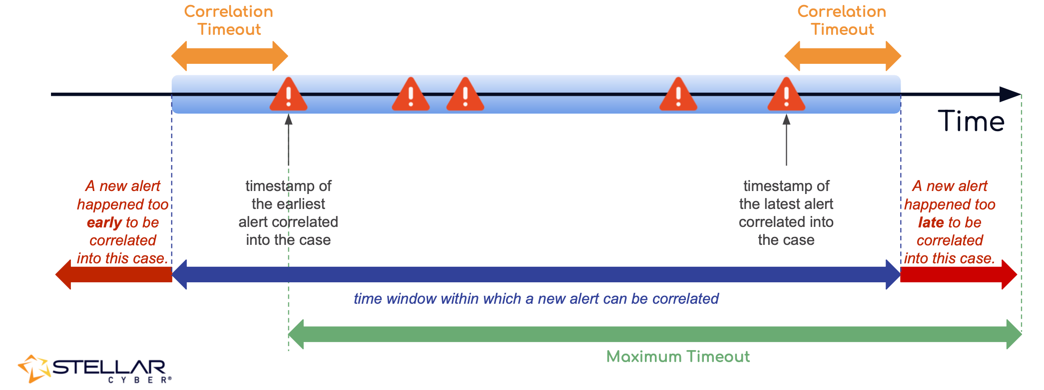 An alert can be correlated into an existing case if it occurs within a specific time window of the case. This time window is determined by Correlation Timeout, which is the amount of time that has passed after the latest alert that was correlated into the case or before the case's earliest correlated alert. The figure below illustrates how this works: