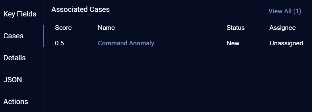 The Cases list shows cases associated with the selected alert in descending order by score, up to a maximum of five. You can click the View All (x) link at the upper right of the list to open a new tab with a filtered view of the Case summary page showing just those cases associated with the selected alert. You can also click an individual case's entry in the list to open its associated Case details page. The figure below shows the Cases list for a sample alert's Event Details view: