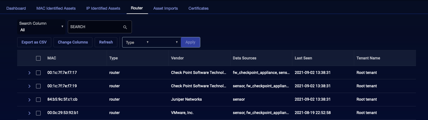 You can tell Stellar Cyber that an asset is a router in the MAC Identified Assets and IP Identified Assets tabs.