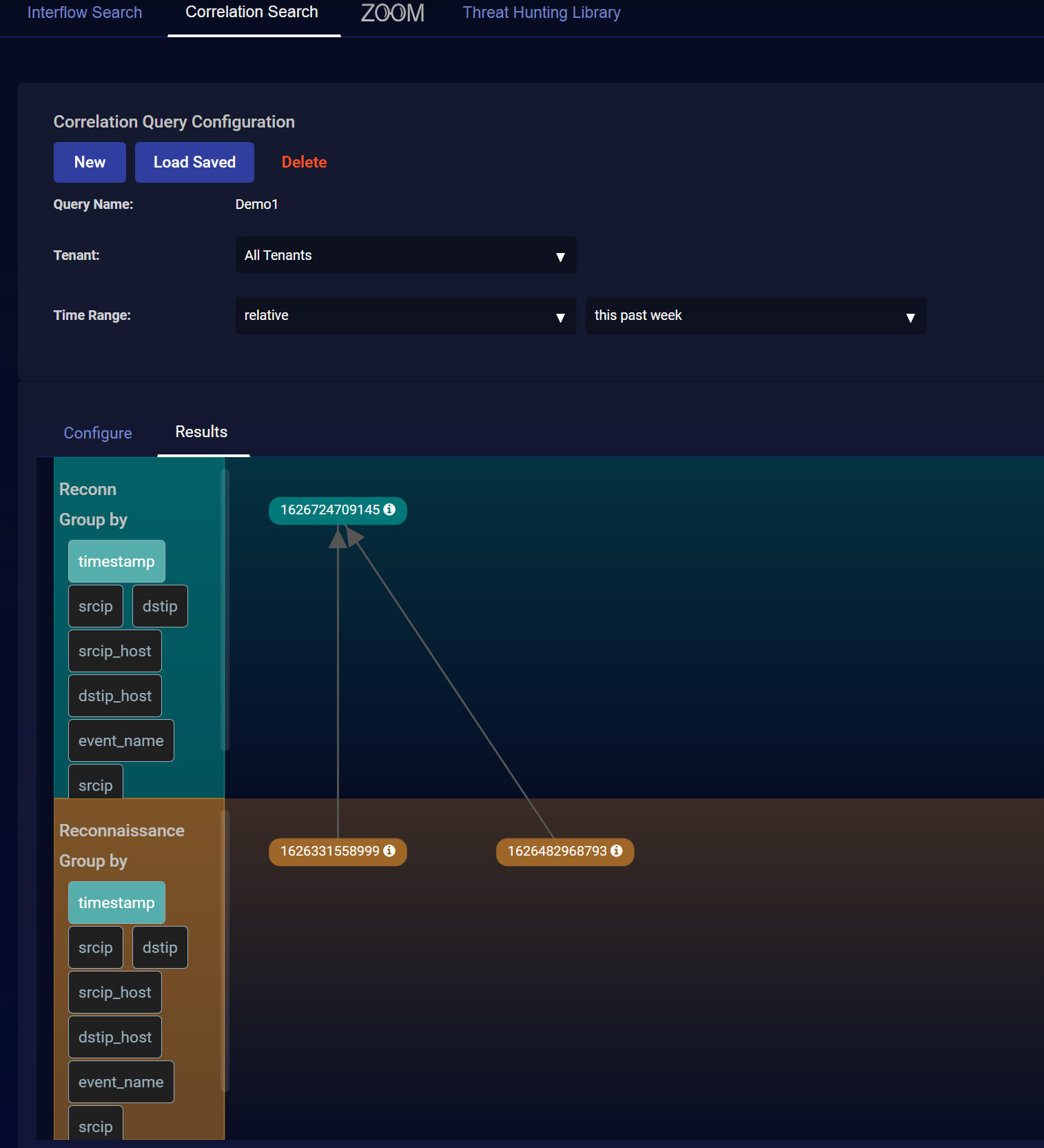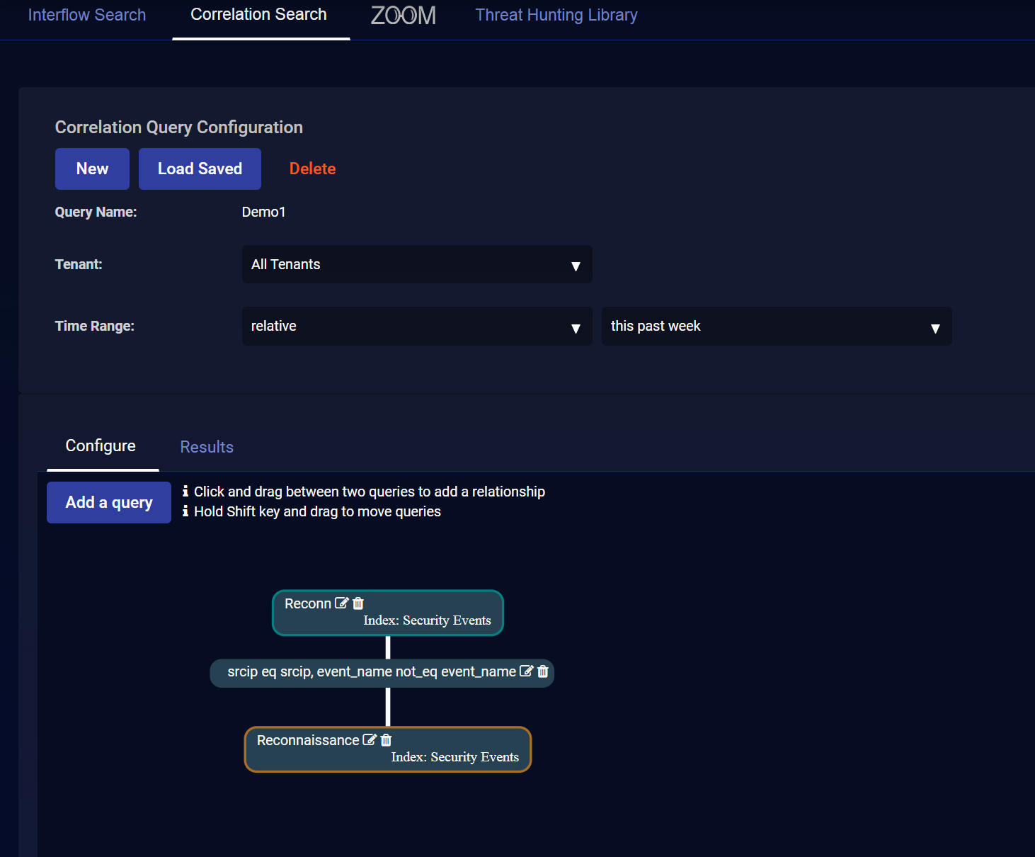 Define a query or choose a saved query. For this example we chose Reconn, which finds reconnaissance events.