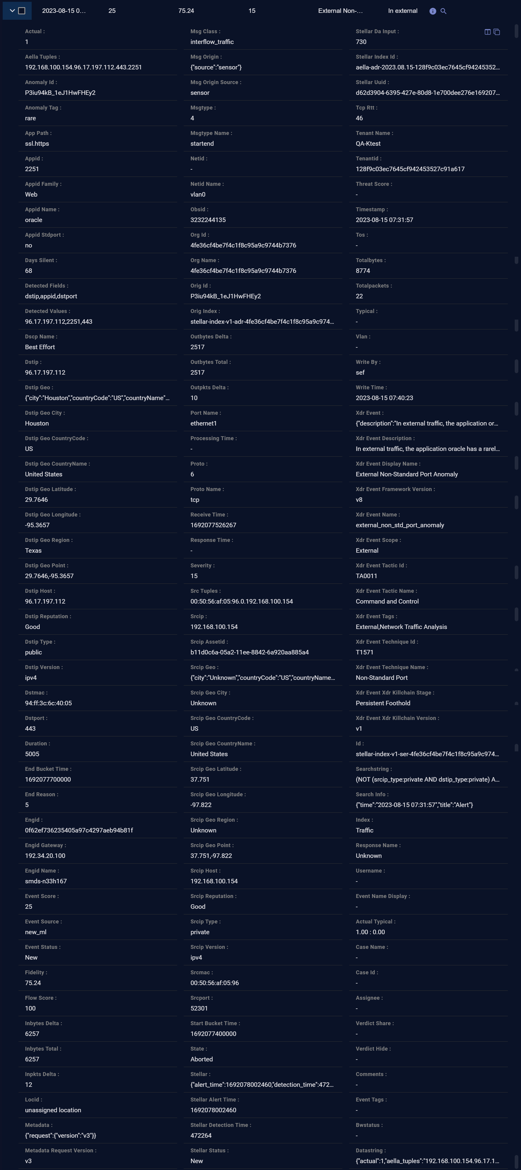 When Stellar Cyber populates these fields, it typically substitutes the ampersand ("&") character for the shorthand usage of "n" for "and" in the Interflow itself. For example, the reputation value of SpywareCnC from the Interflow is displayed in the user interface as Spyware C&C. There are other similar substitutions, as well (Peer-to-Peer for P2P).
