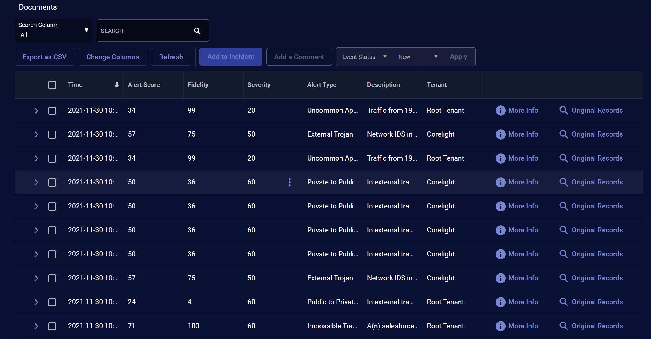 Each row provides an overview of each event. Click the checkboxes to the left of each row to select records. You can also assign security-related events to Cases or create a new Case based on one or more alerts.