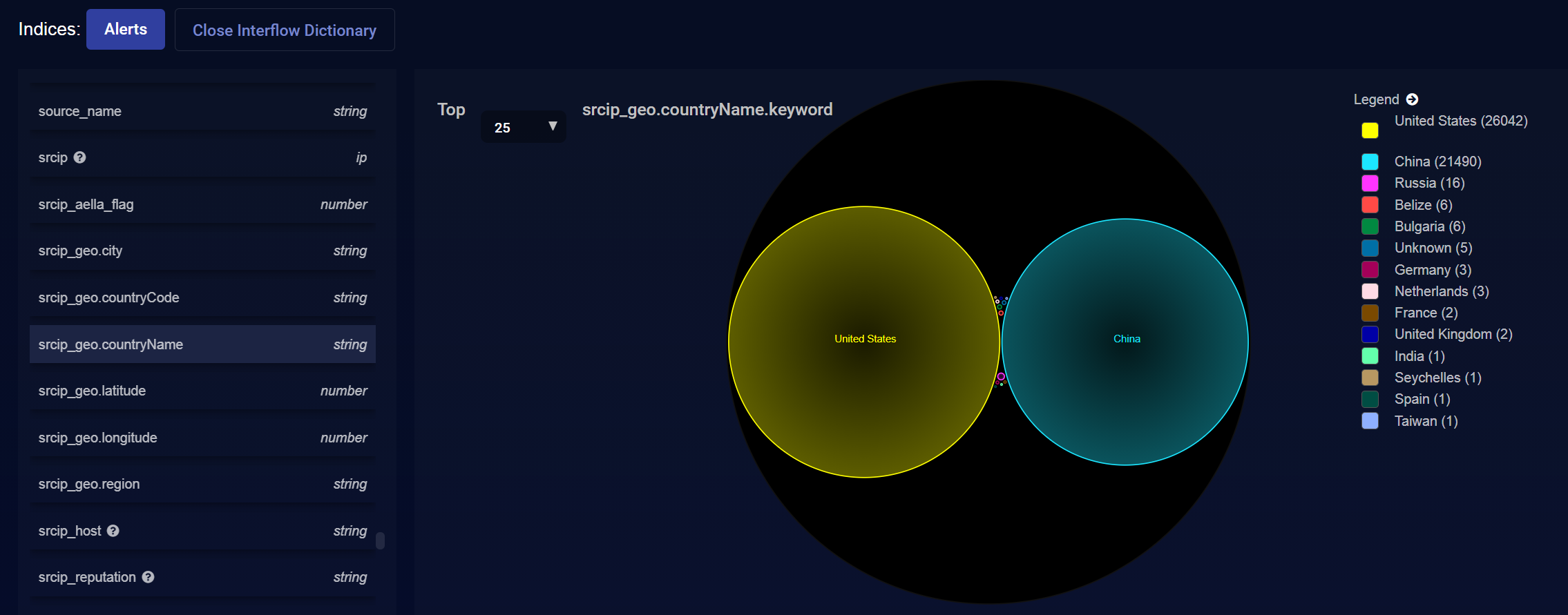 - Click on that keyword. The visual dictionary immediately changes to reflect your choice. We chose srcip_geo.countryName.