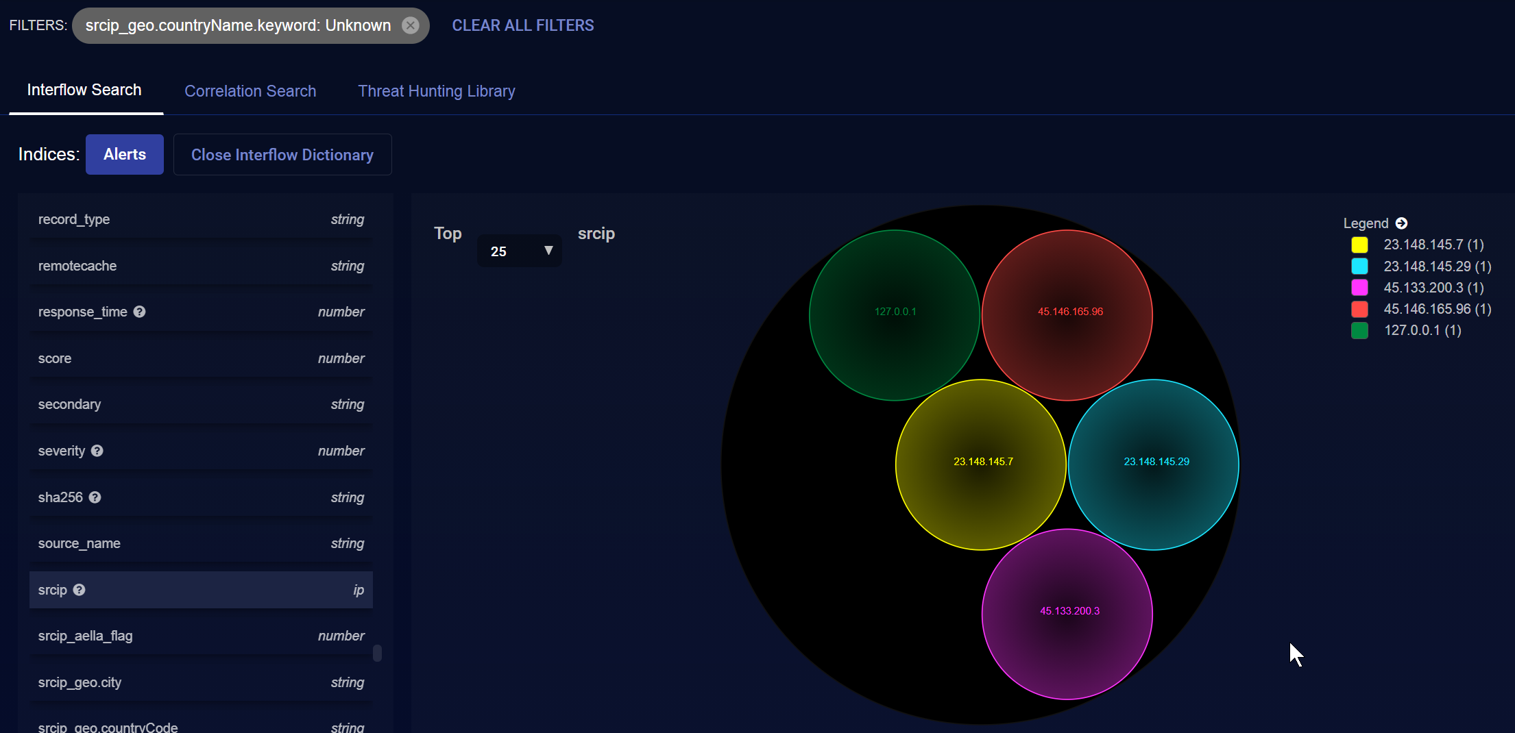 - If we click , Unknown is added to the filter and the results are immediately filtered. Now we only see results with a source IP address from an unknown country.