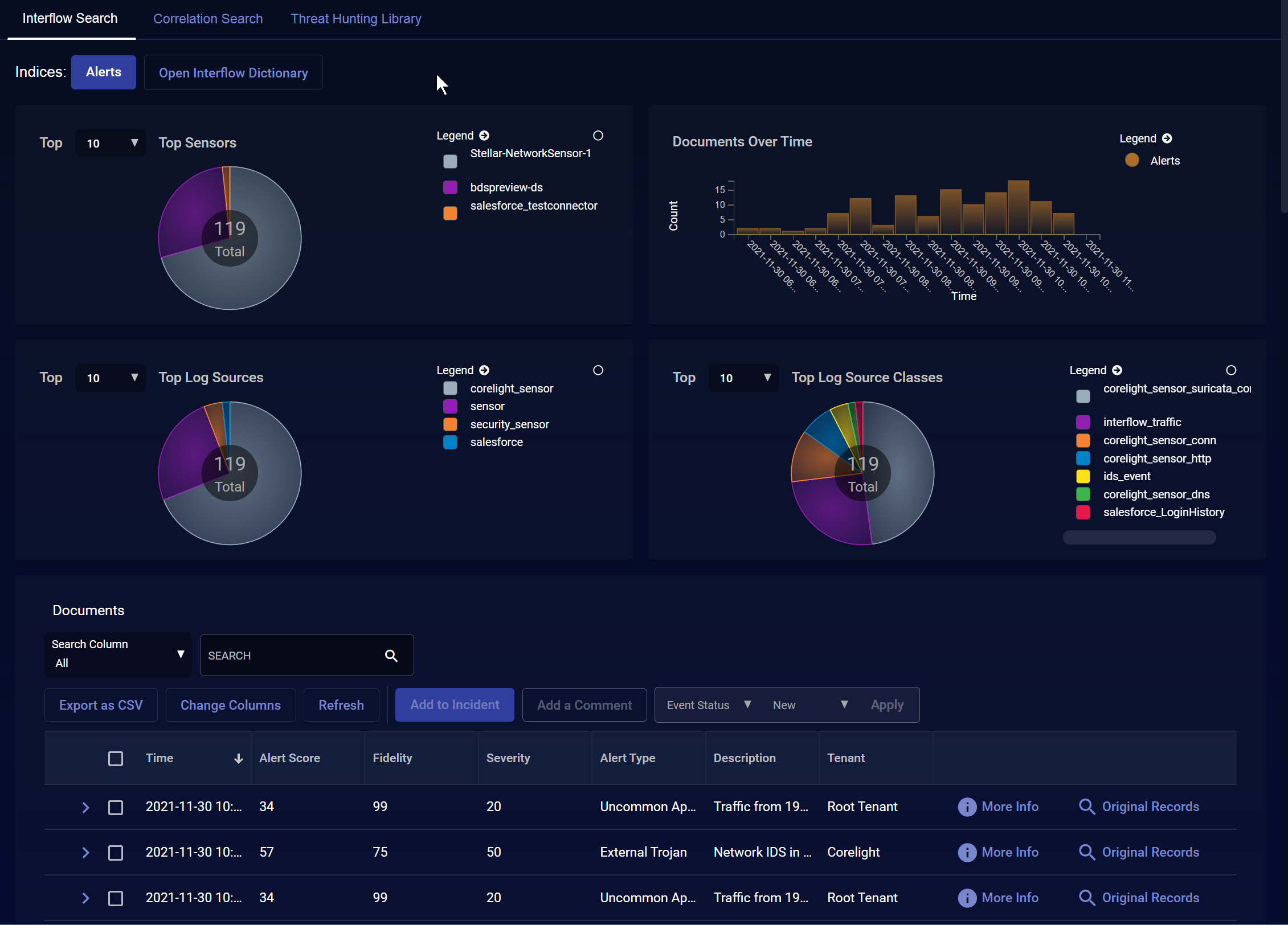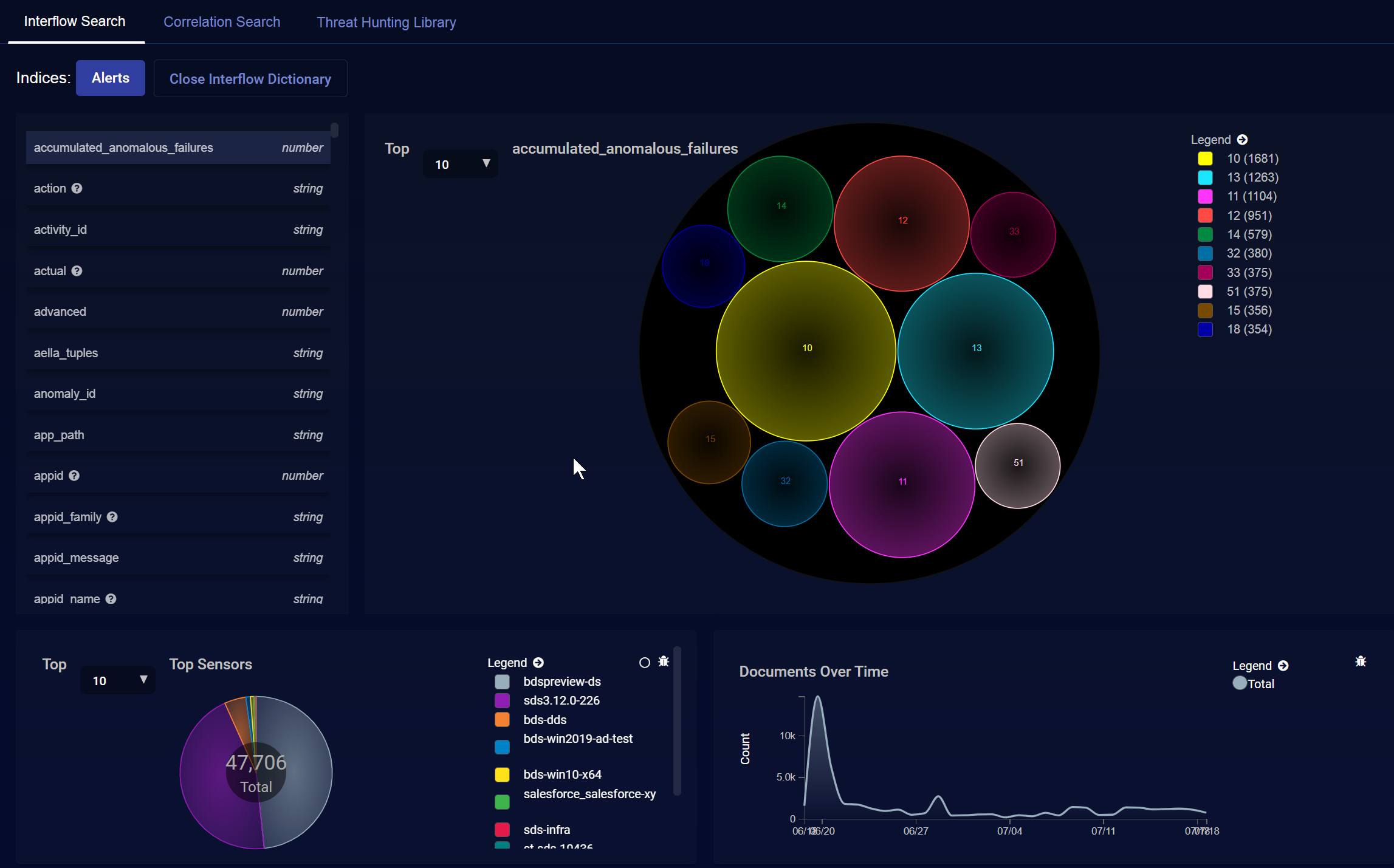 Interflow Search: The default tab, an overview of all events. From here, you can use the following query tools: