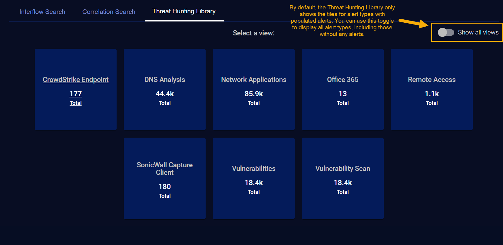 By default, the Threat Hunting Library only displays tiles for alert types that are populated with alerts. As illustrated below, you can use the Show all views option to toggle the display between showing all alert types and only those populated with alerts.