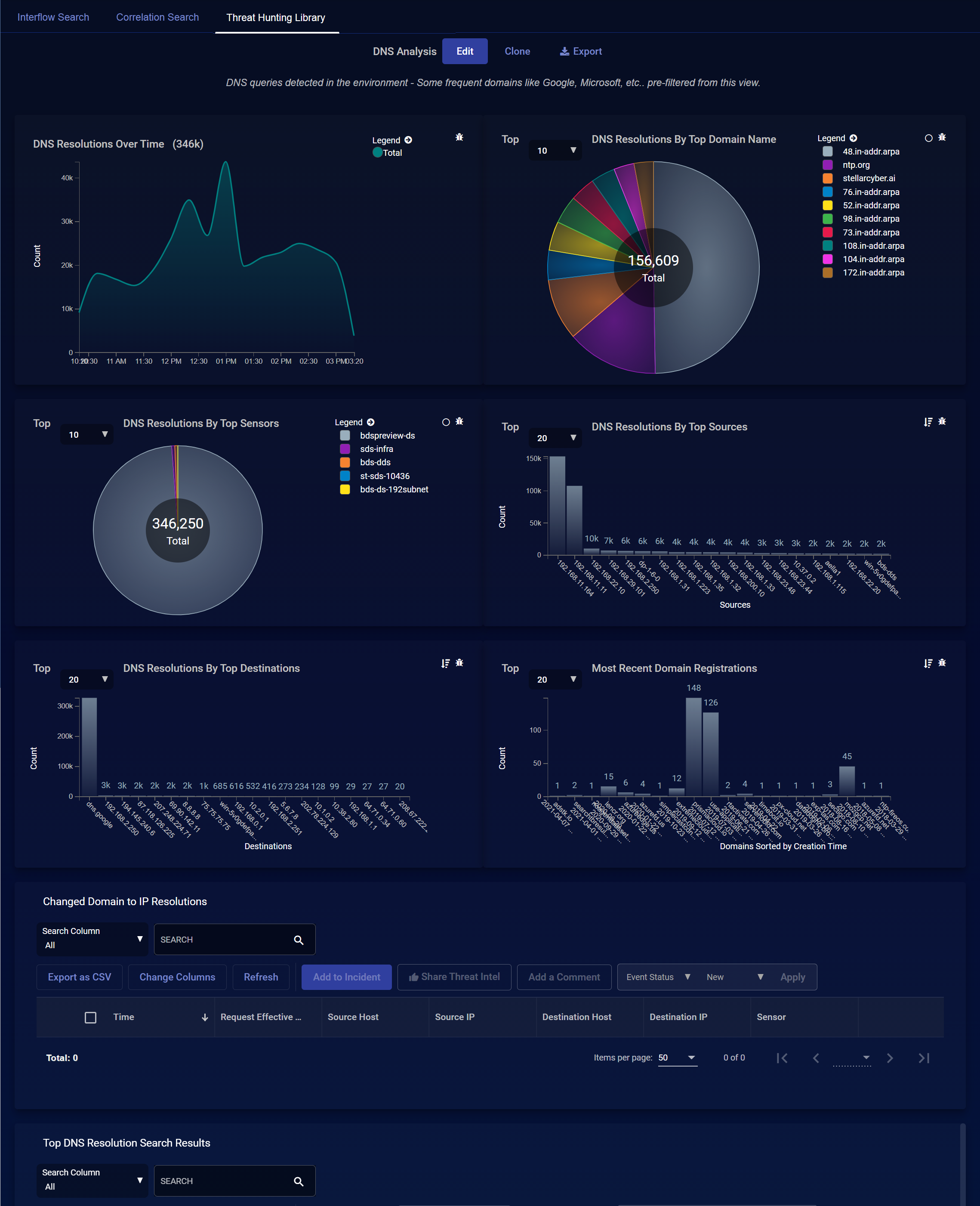 For DNS Analysis, the tables are Changed Domain to IP Resolutions, and Top DNS Resolution Search Results.