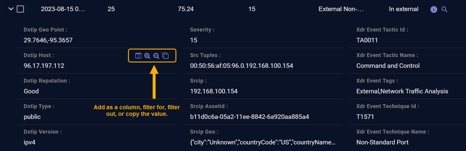When you leave this page, any filters remain selected. So you can continue your threat hunting on other parts of Stellar Cyber.