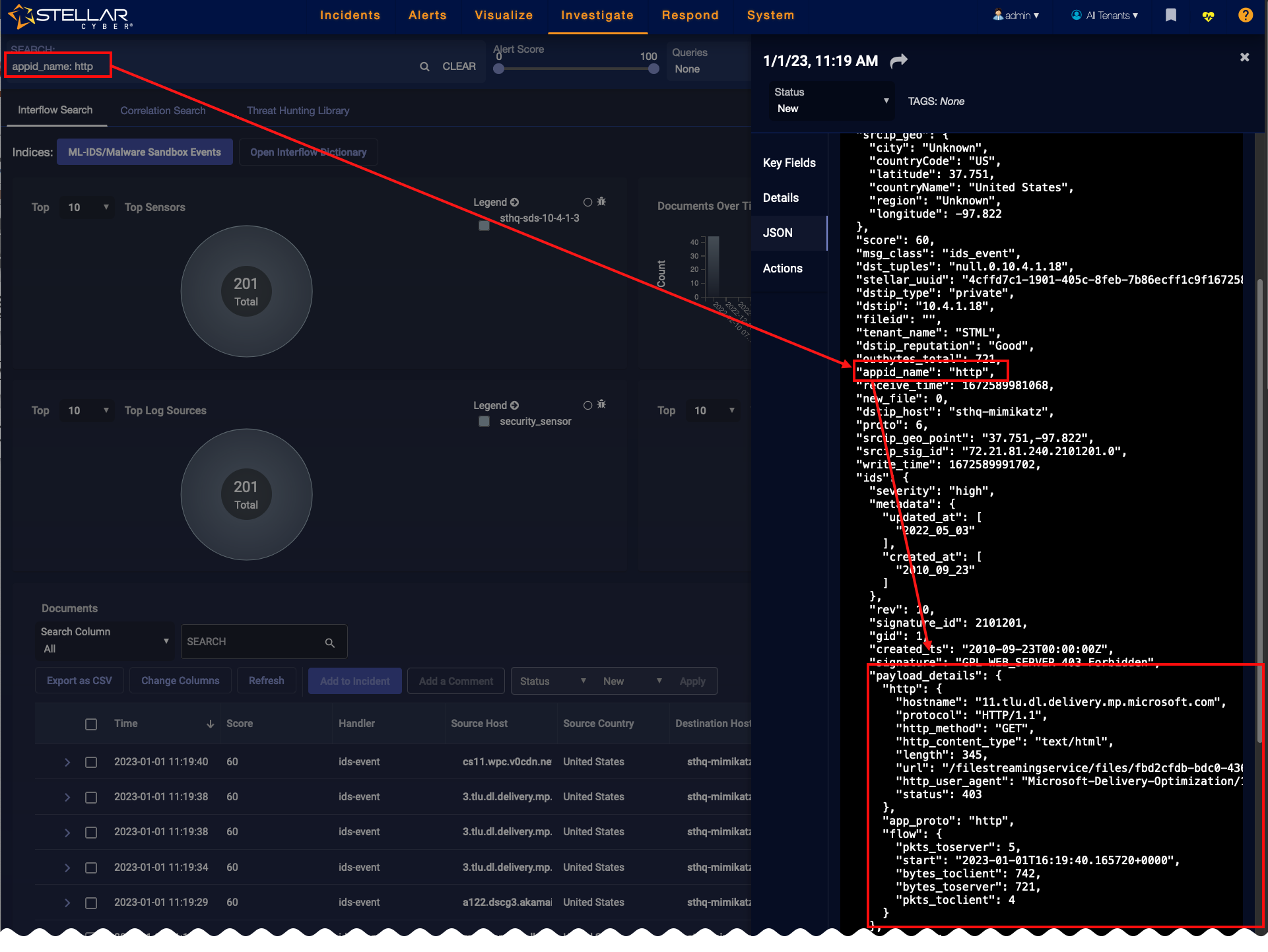 Following is an example search for IDS records with payload data. The payload feature is supported with dns and http, so let's create a query that searches for just this feature for just that app type.