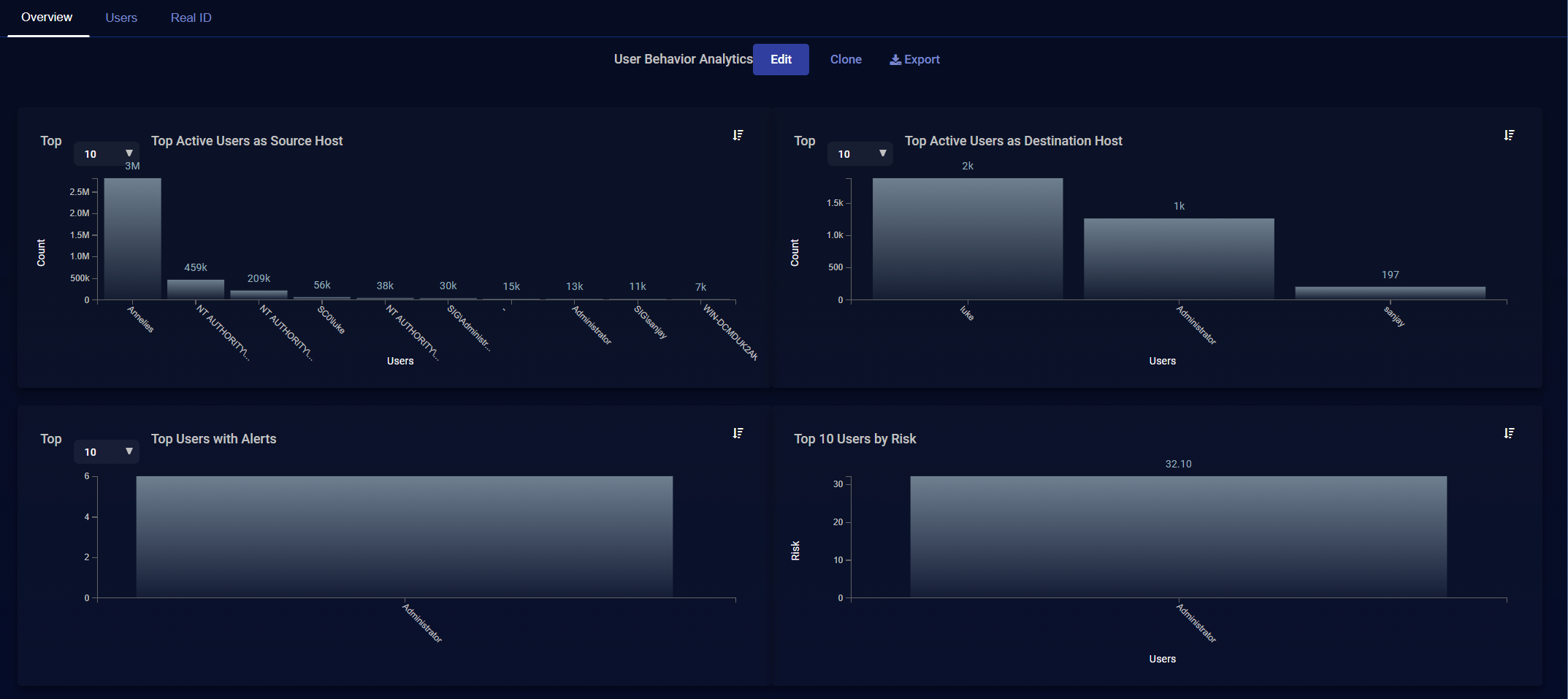 The overview dashboard provides a visual perspective of top users for aspects that may be of interest for further analysis.