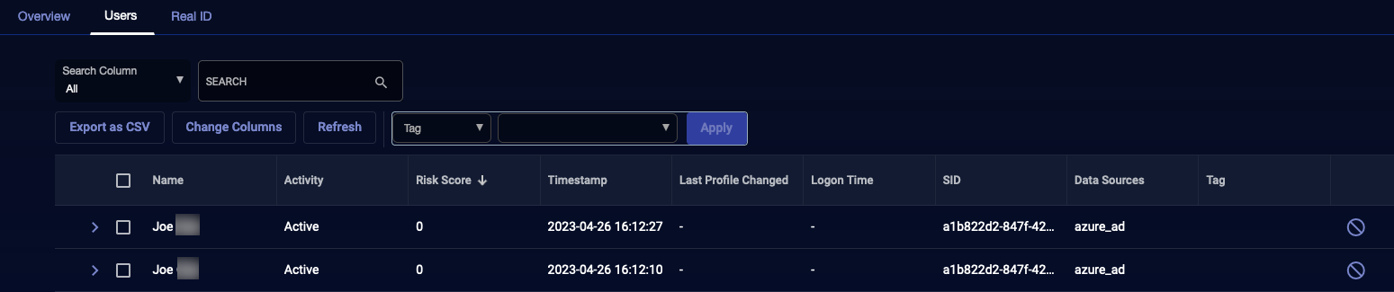 The Real ID dashboard shows a table of users with all of their various identities. The identities are imported from Active Directory and correlated with a single SID. That SID is used to link all user identities.