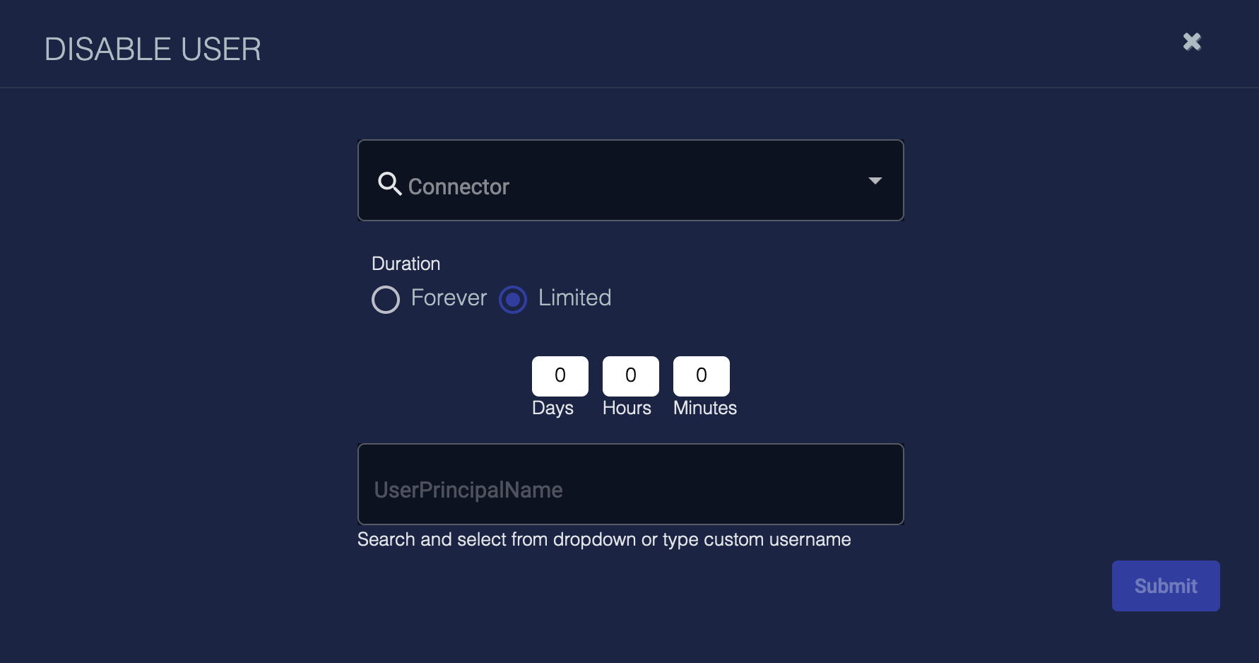 4. Choose a user name from the UserPrincipalName drop-down or type the name of the user to disable.