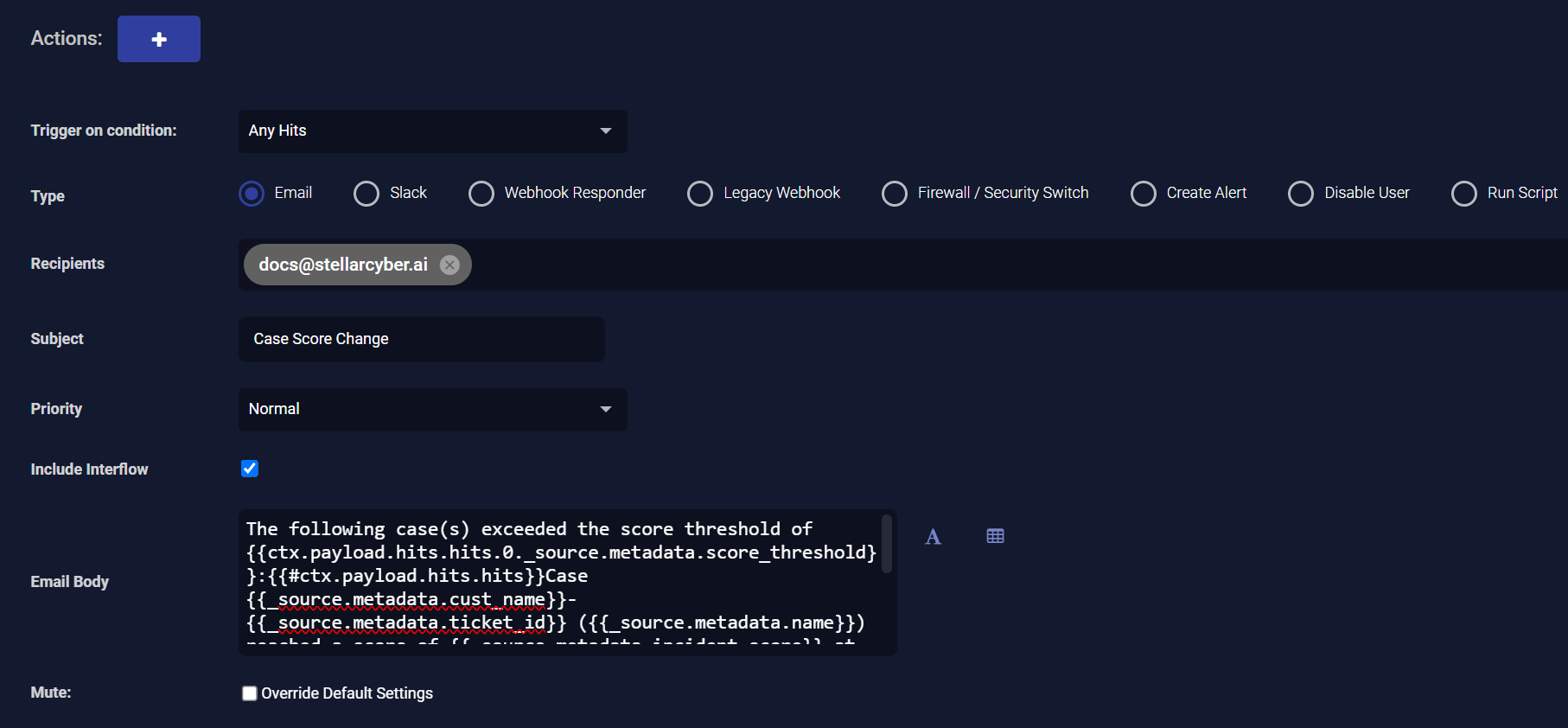 Before you create the playbook to notify on case scores over a threshold, it's important to understand what you're searching for. The first time a case's score passes the threshold of 50, Stellar Cyber creates a special document in the aella-syslog index with a msg_class of incident_score_change. This is the document your playbook searches for so that it can send an email or Slack message with information on the case and a link to its detail page in Stellar Cyber.