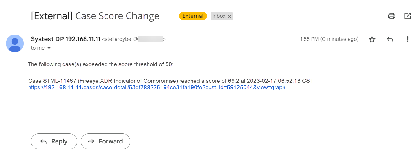 Here is a sample email sent by our ATH Playbook, complete with a link to the case with the changed score: