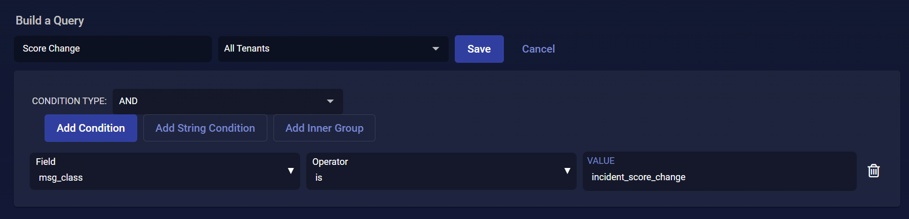 So far, our query just checks for any new documents with a msg_class of incident_score_change. However, we can add a second AND query condition so that it only matches cases over a specified threshold greater than 50. The logic is like this: