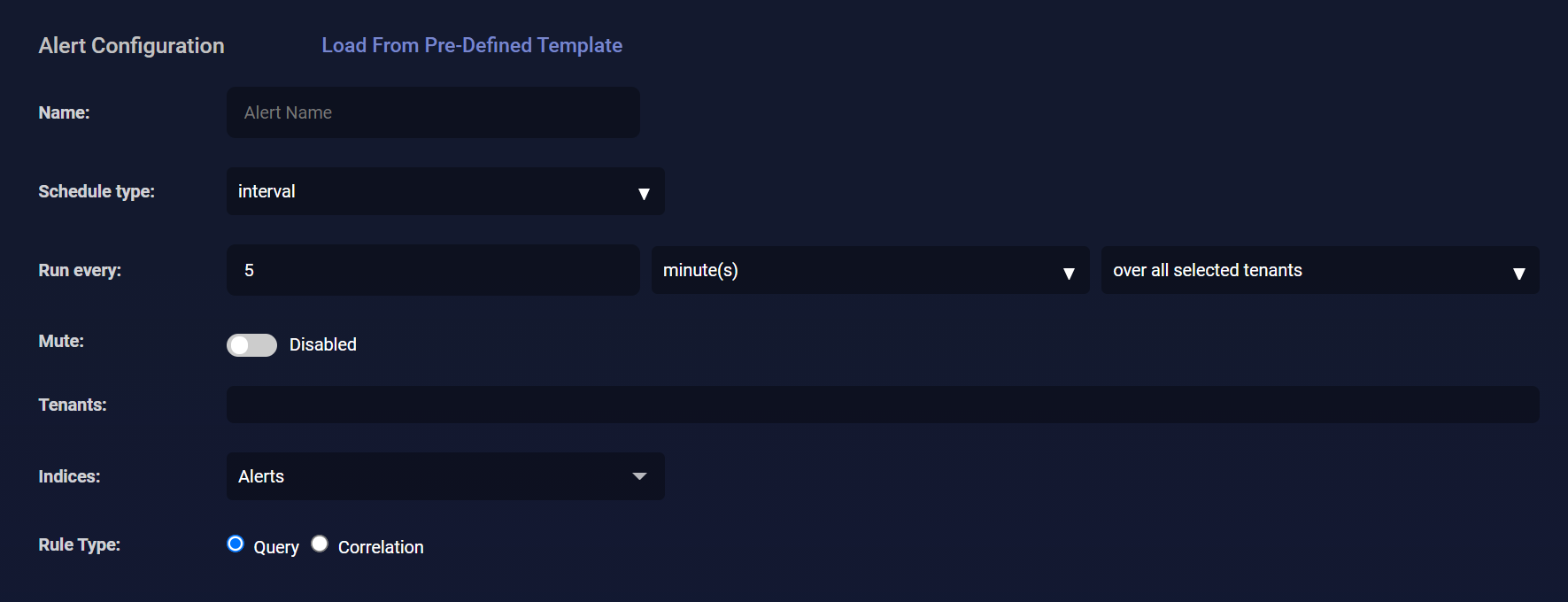 1. Define the name and schedule and specify the tenant and index in the Alert Configuration panel.