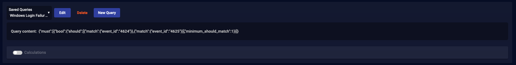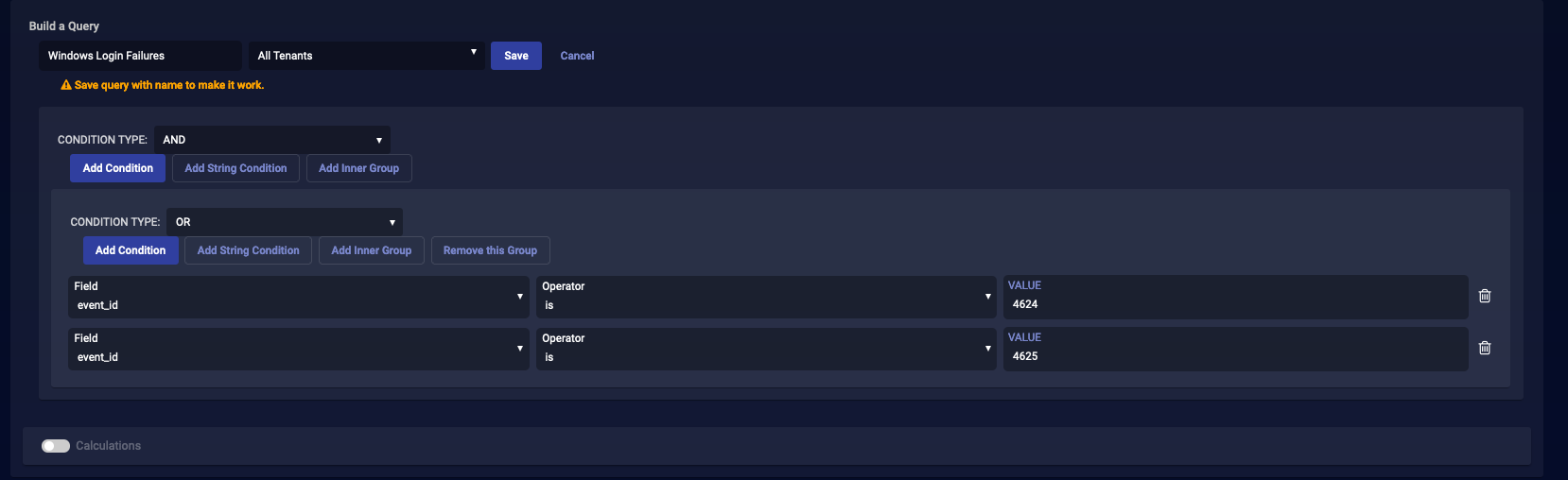2. Build your query. In this example, we’re looking for specific Windows events. Event ID 4624 is any Windows login, and 4625 is any Windows login failure.