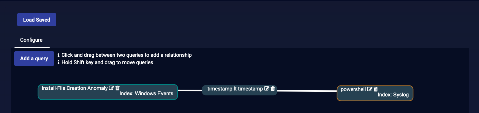 The Correlation screen appears if you select the Correlation as the rule type, above. Our main example uses a simple query, but you can also configure a correlation.
