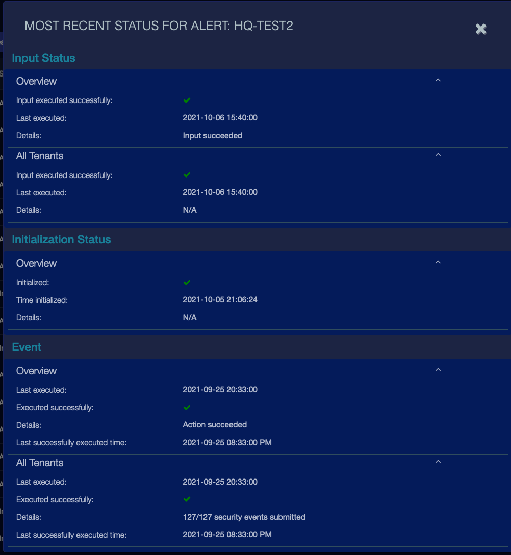 • Click and Last Status to see the results of the last time the playbook ran, including the email address where any email notifications was actually sent. The screen is similar to the following.