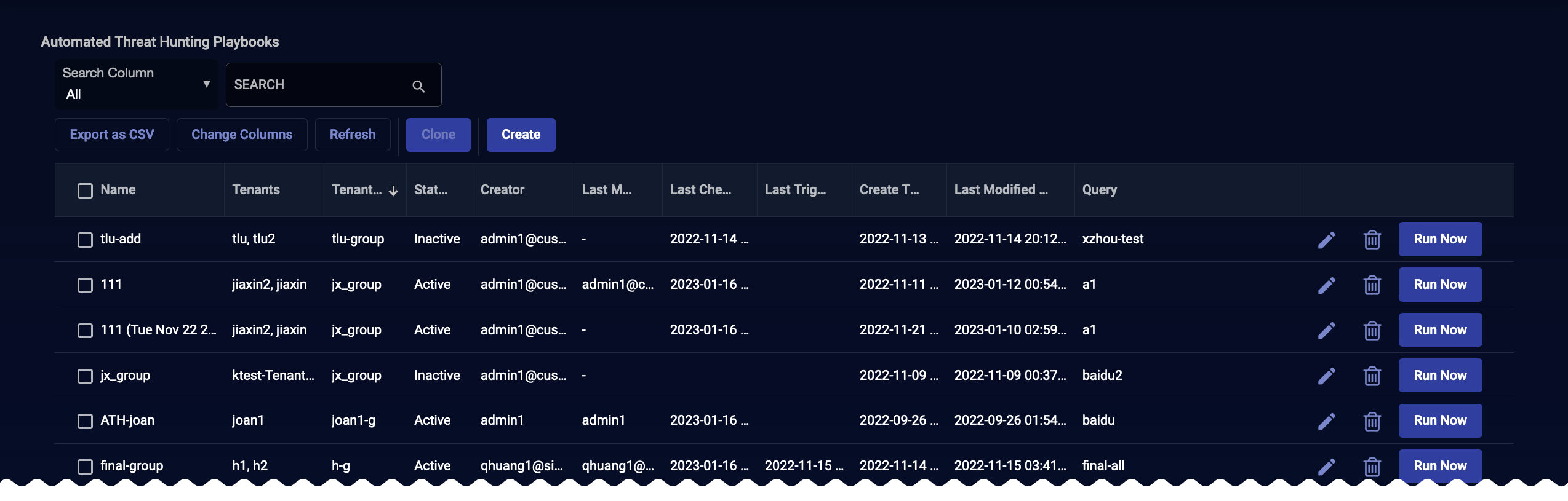 • Cloning: To use an existing playbook as a template, select one or more check boxes at the start of a row and then click the Clone button. The playbook(s) are duplicated and named the same as the original with a timestamp added. Edit the copy to customize it, as needed.