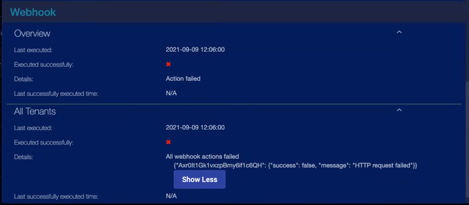 In cases where the action failed and that failure generated a log file, you can use the Show Logs button to examine the log detail.