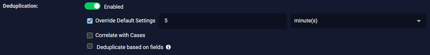 • Use the Override Default Settings option to specify a custom time window within which multiple instances of the same alert are deduplicated.