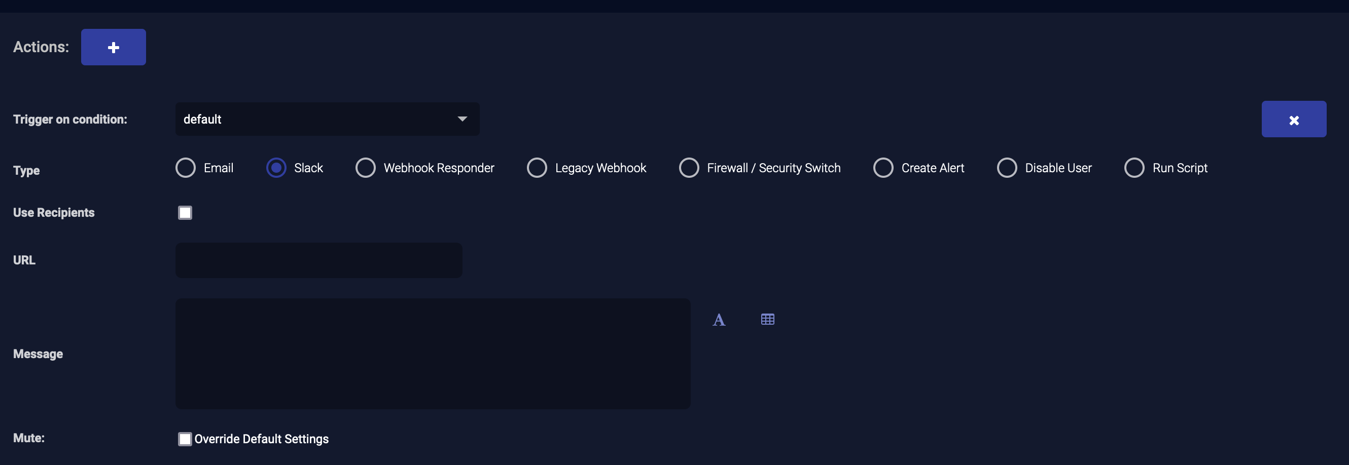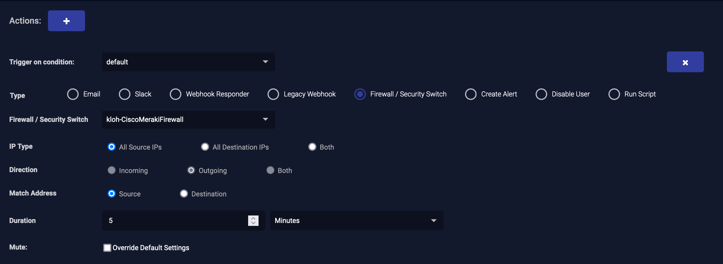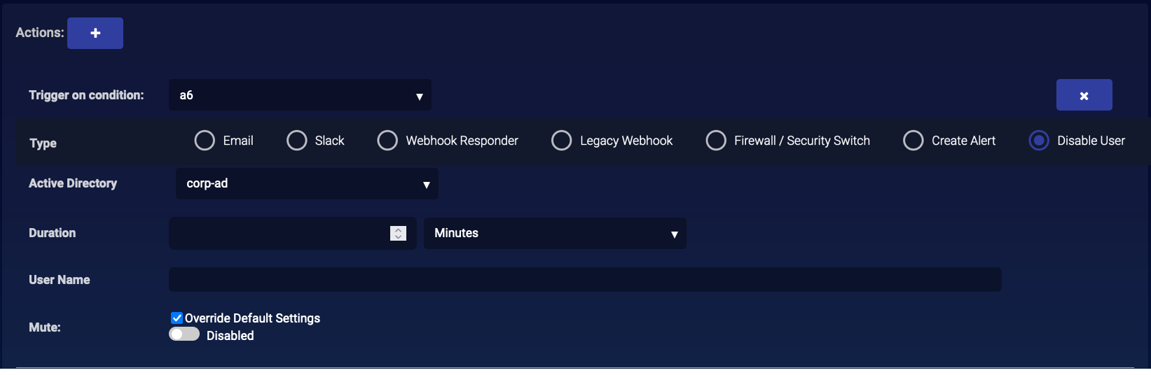 You can use the Mute feature in the Actions panel to temporarily halt specific individual actions associated with a playbook. Click the Override Default Settings checkbox and toggle the Mute | Disabled slider to Enabled. Then, use the adjacent fields to specify for how long you would like to stop the action from triggering.