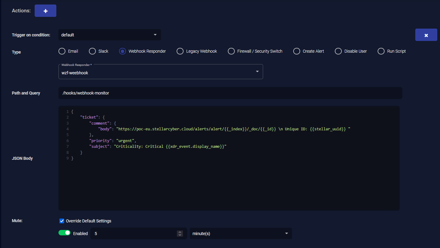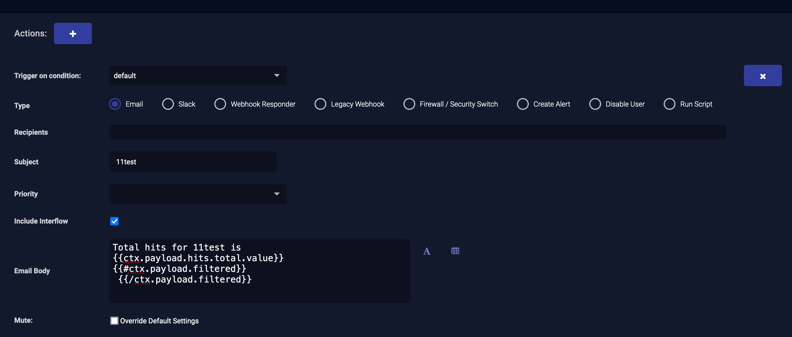 You can also mute individual actions associated with the playbook. Note that Alert level mutes take precedence over Action level mutes. If the alert is muted, no actions will be triggered. If the alert is unmuted, you can mute individual actions.