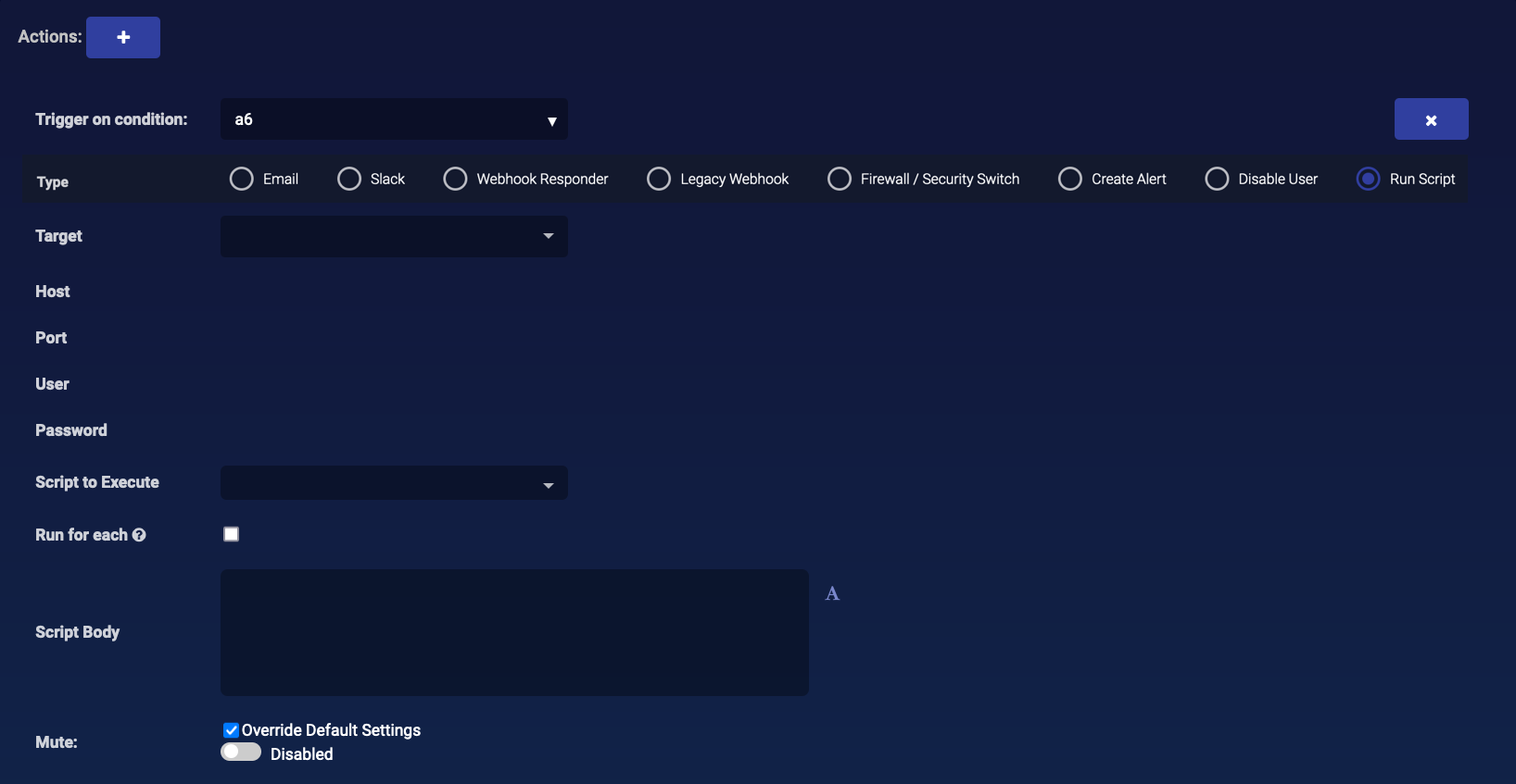 If your script produces an event list with multiple results and an action instance for each result, it's important to select Run for each. If it's not selected, the script renders all results in a single action and Stellar Cyber only runs that action, which might not be the one you want for all results. However, when you select Run for each, Stellar Cyber runs an individualized action for each and every result.
