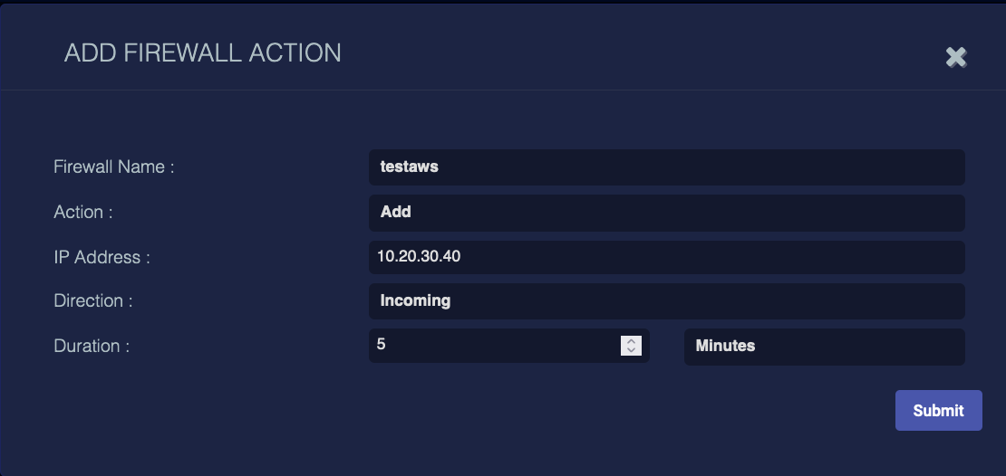 Click Submit. The action goes into effect immediately and appears in the Firewall Actions table.