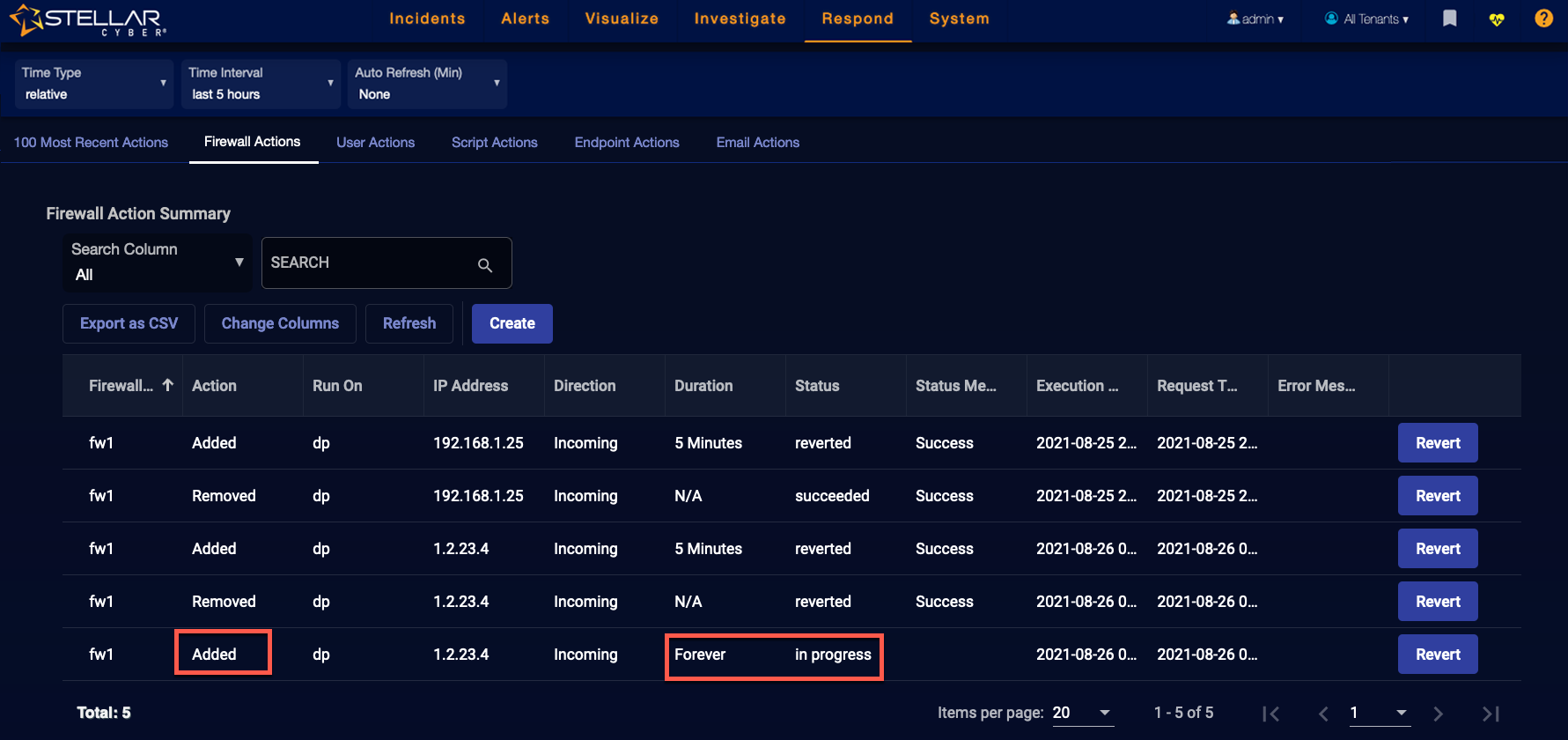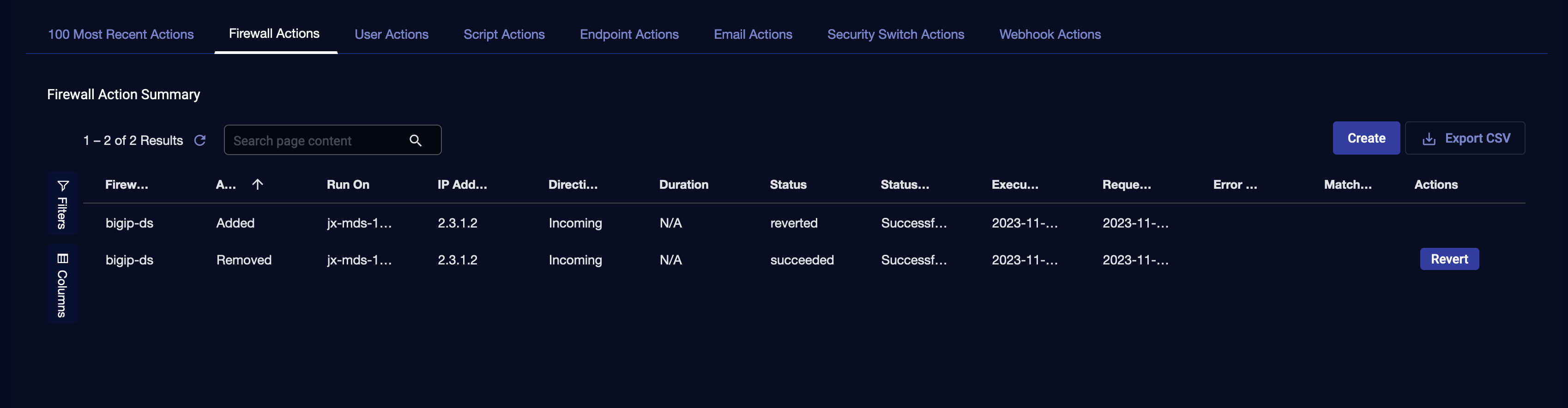 The Respond | Actions | Firewall Actions tab displays the firewall actions taken manually from the Event Display or automatically by Automated Threat Hunting. The rules pushed from Stellar Cyber can tell the firewall to block network traffic that is suspected (or proved) to be a security breach. The rules can be temporary or permanent. This page displays the firewall actions taken by Stellar Cyber, and allows you to add and revert actions.