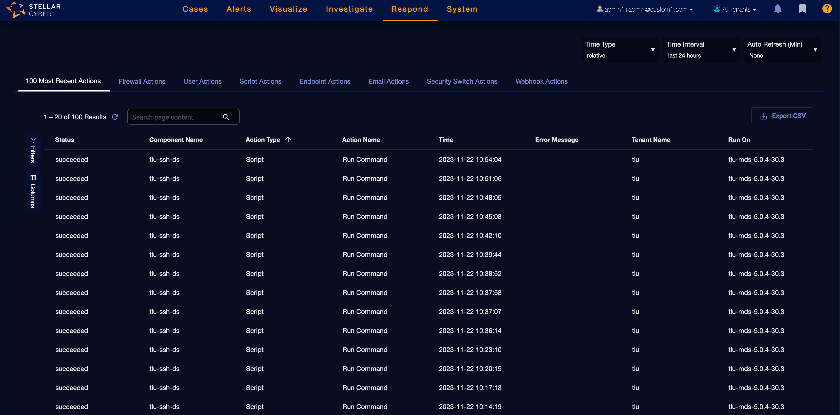 The Respond | Actions page provides the ability to view and manage actions submitted from other pages such as Event Details or Automated Threat Hunting. For guidance on how to configure actions, refer to: