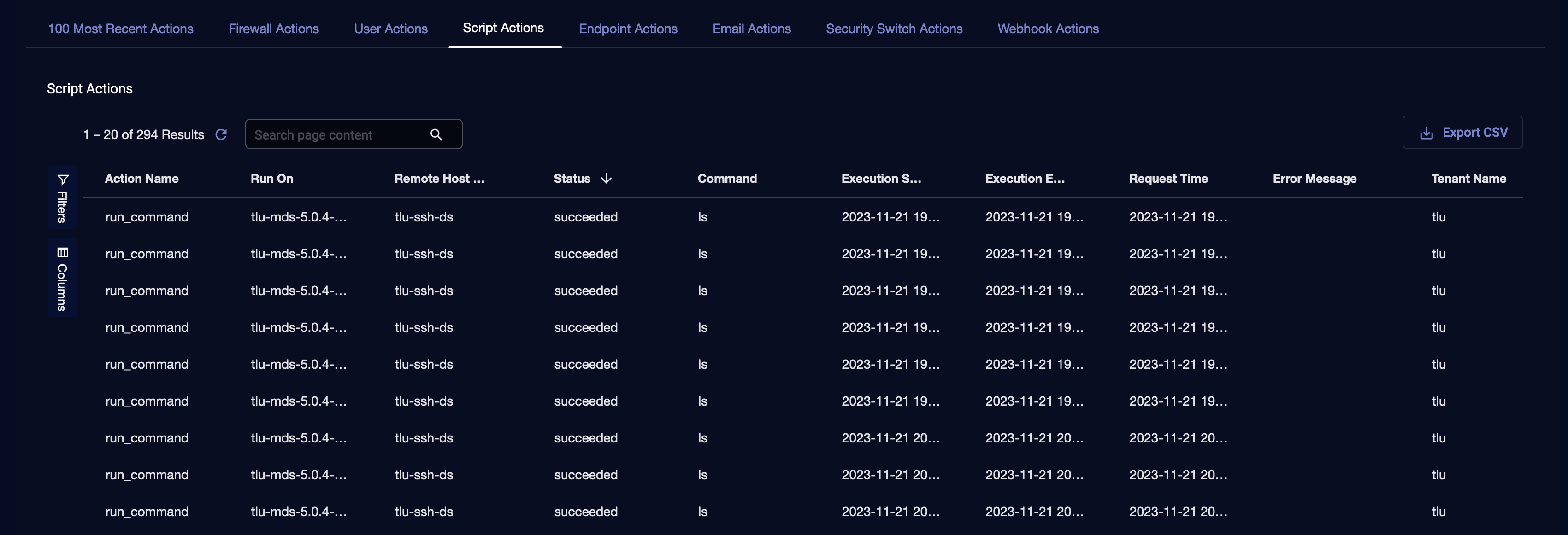 The Respond | Actions | Script Actions tab displays the script actions specified manually from the Event Display or automatically by Automated Threat Hunting. Use the columns to reveal more information about the script itself. Scripts can be created in advance by users with administrative access. See Creating Saved Scripts.