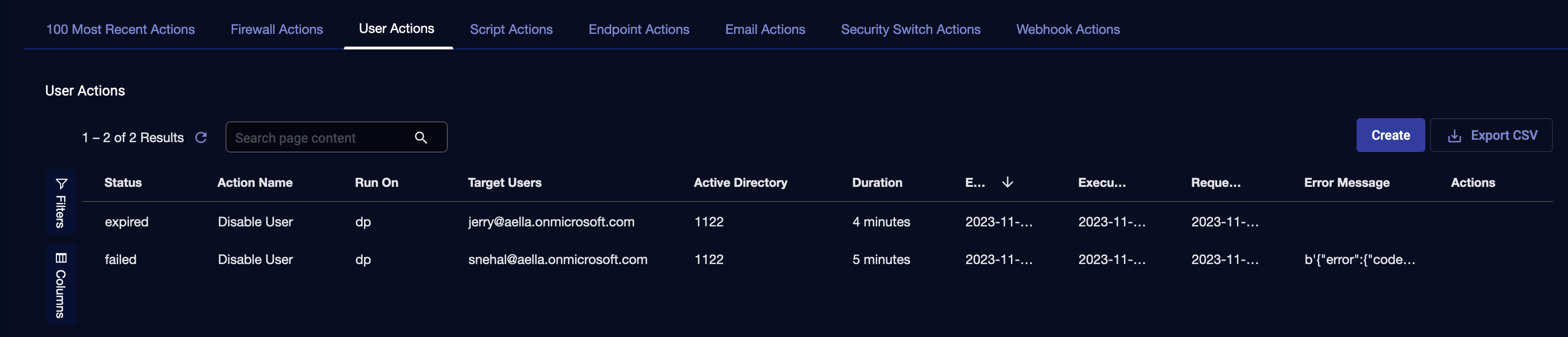 The Respond | Actions | User Actions tab displays the user actions taken by Stellar Cyber. If a user is disabled manually from the Event Display or automatically by Automated Threat Hunting, that action appears here.