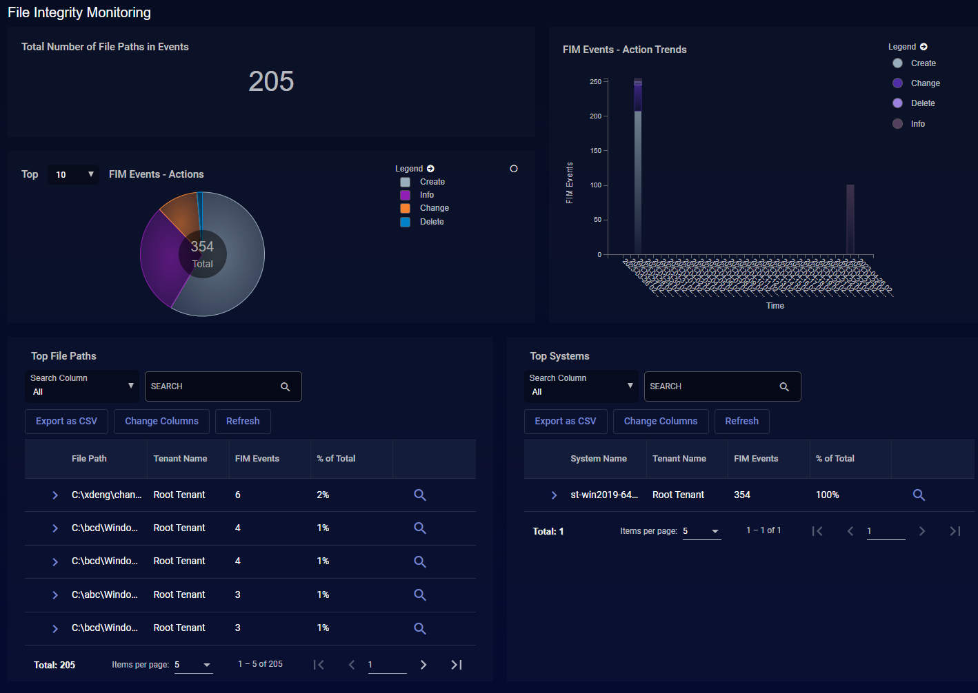 The File Integrity Monitoring dashboard breaks out FIM events in the following charts and tables. Note that all charts and tables are based on the FIM events included by the current