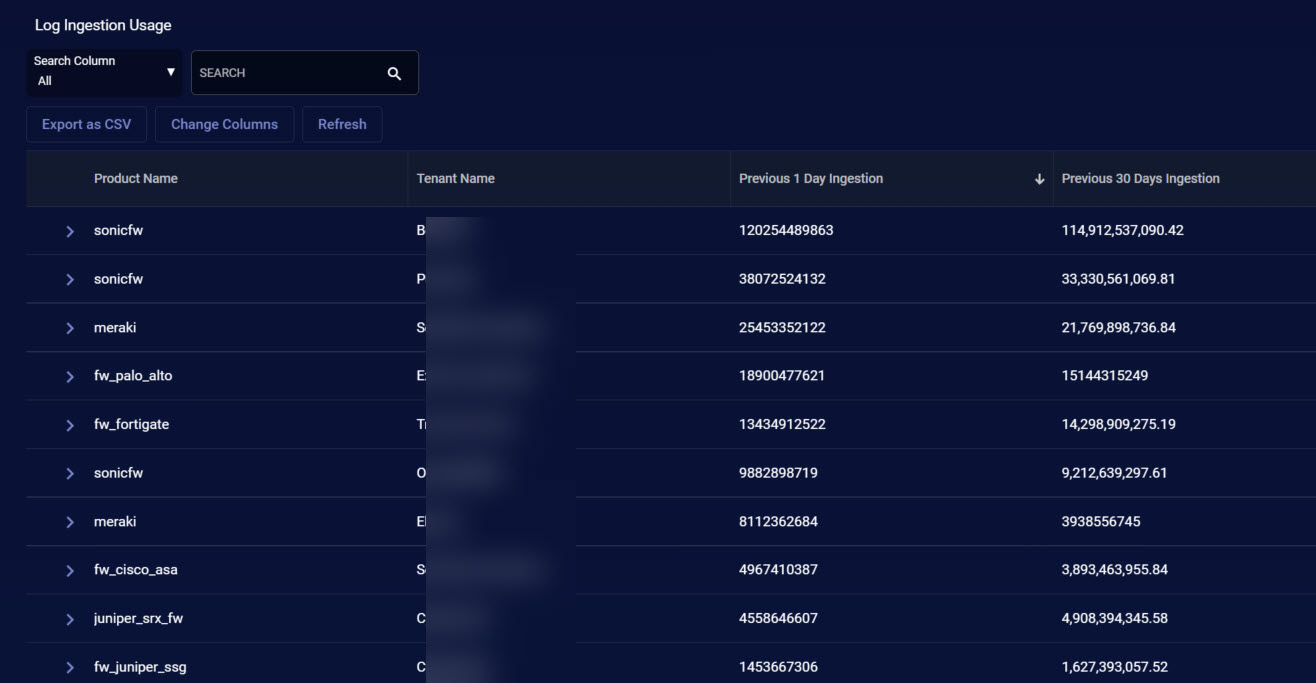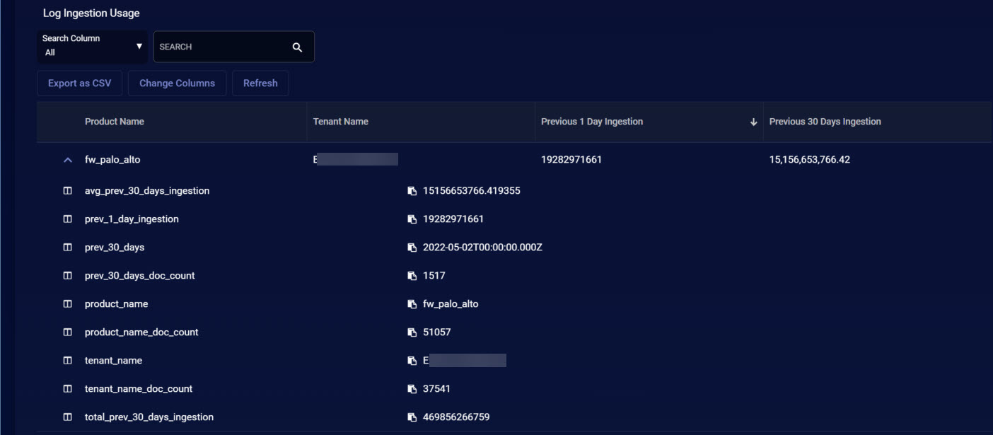 Each of the tables in the Ingestion Dashboard supports standard table actions, including search, sort, CSV export, column change, and table refresh.